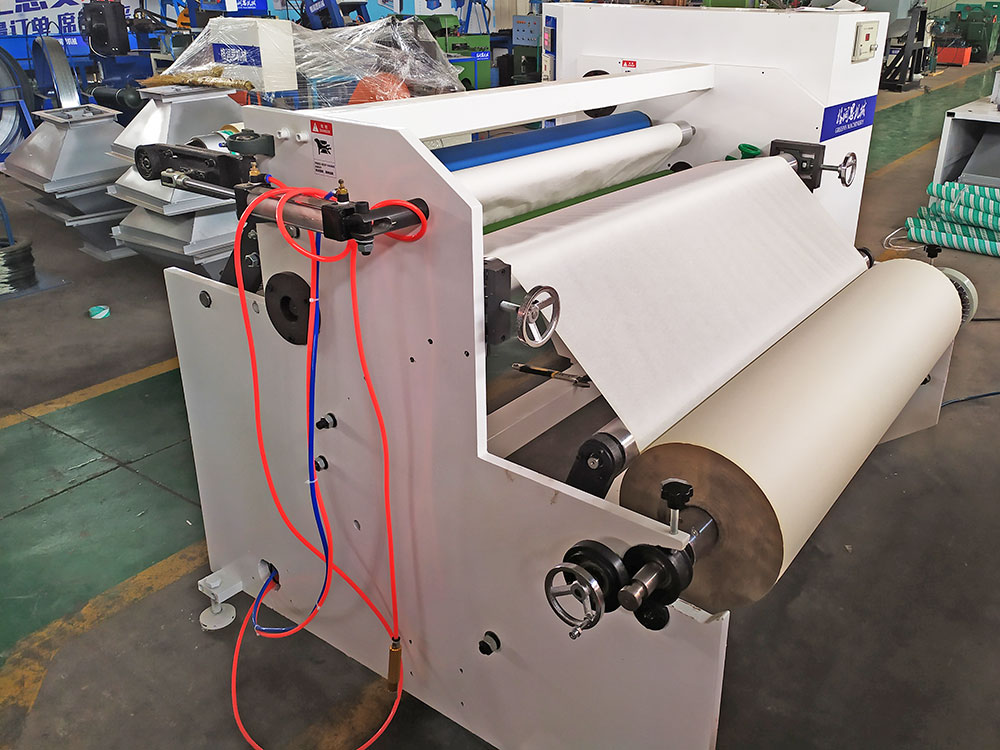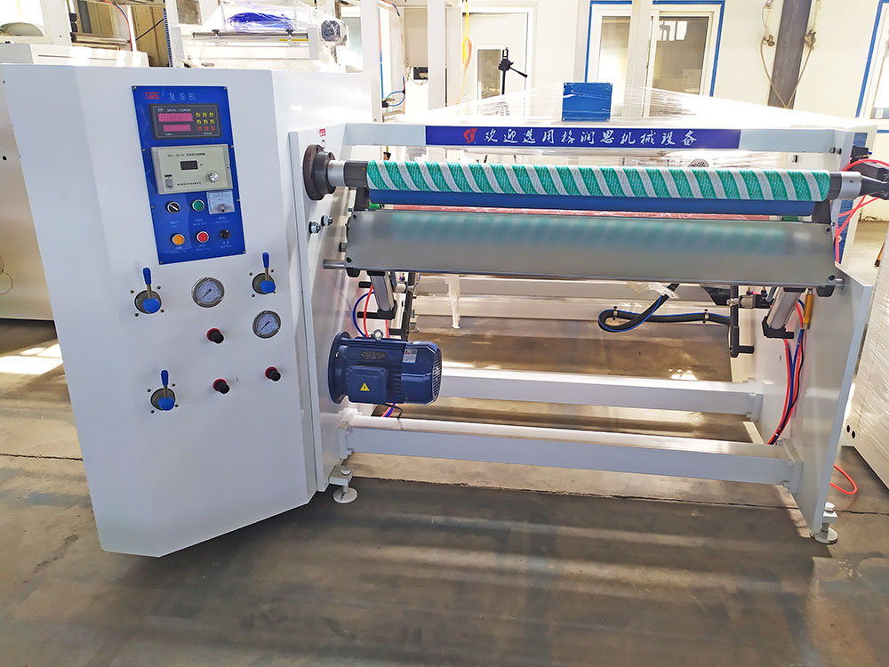 6. 壓料輪有汽缸控制,壓力位可調式。將半成品適當壓著,確保半成品于復卷過程中極為平穩順暢。